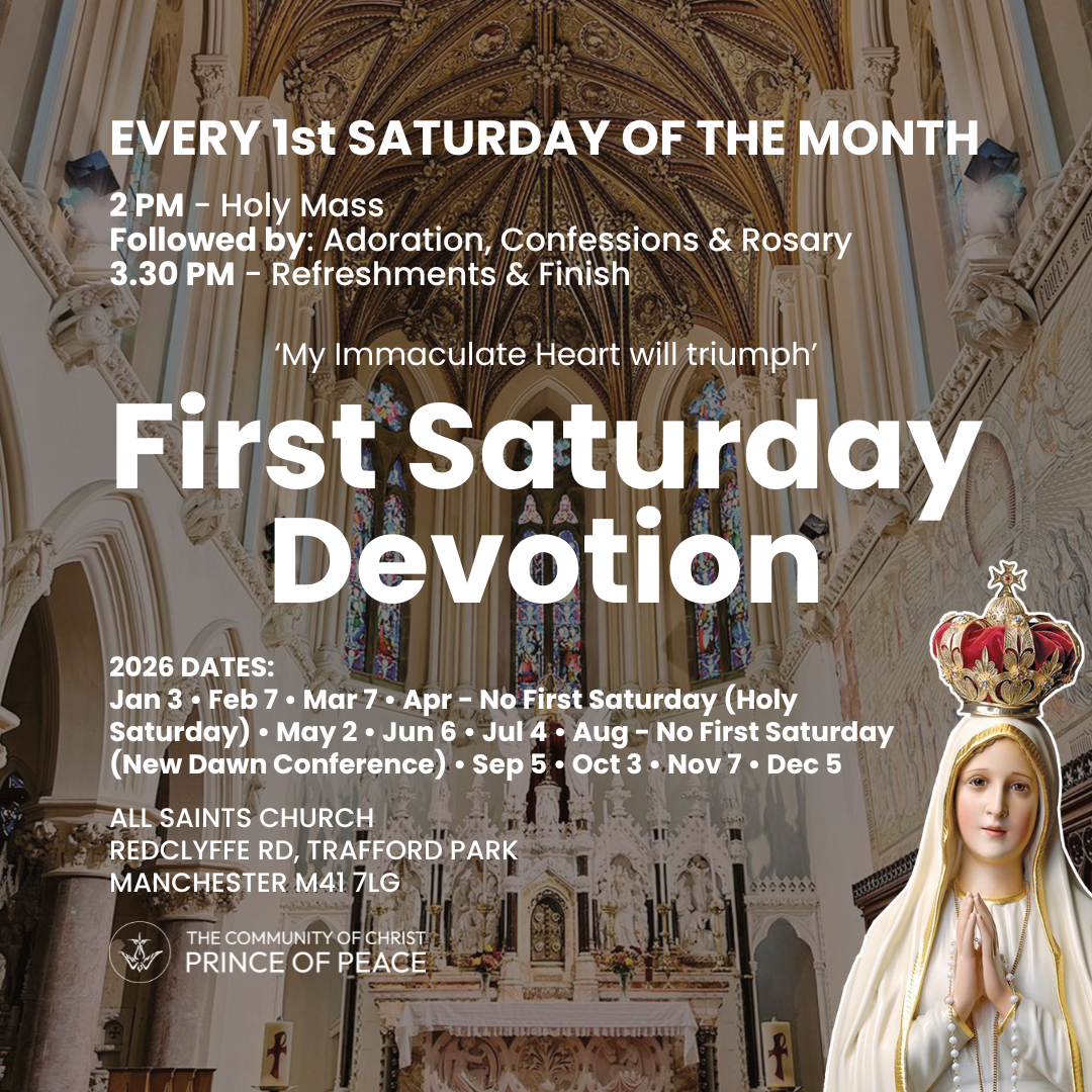 Come and join us the 1st Saturday of every month for Holy Mass, Confession, Eucharistic Adoration, and the Rosary – just as Our Lady requested in her message at Fatima: “I promise to assist at the hour of death with the graces necessary for salvation all those who, on the first Saturday of five consecutive months, go to Confession, receive Holy Communion, recite five decades of the Rosary, and keep me company for fifteen minutes while meditating on the mysteries of the Rosary, with the intention of making reparation to me.”
